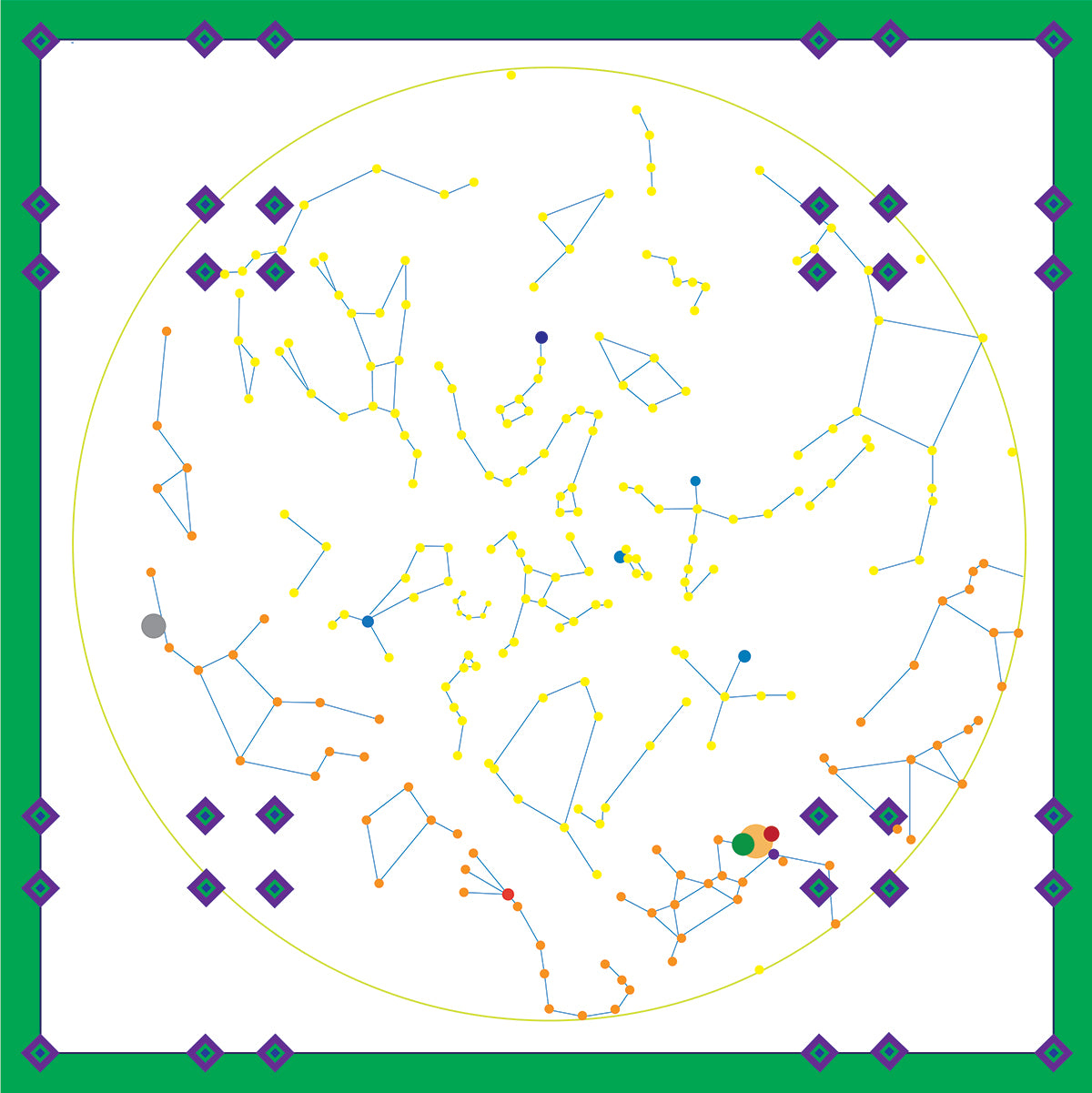 Familiar constellations will sometimes be in the sky at the moment of your birth. Below on the left, the stars are depicted as yellow circles with a black outline. Then big yellow circle is the sun, the green dot is Jupiter, the red one Saturn, and violet is Mercury.